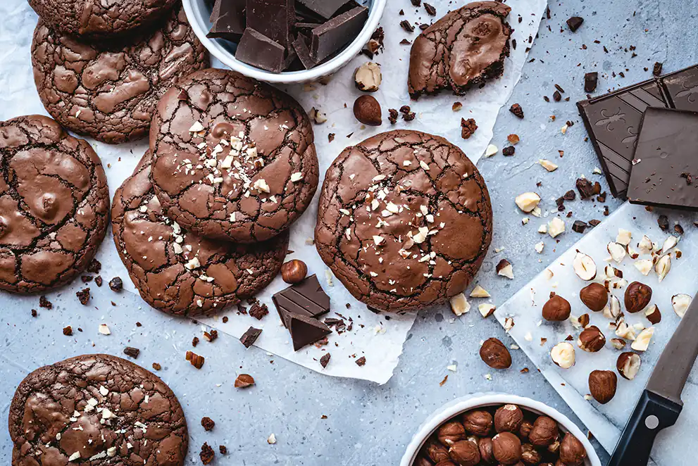 Melt the Chocolate and Vala Pastry in the microwave or by using the bain-marie method. Then, beat the eggs and powdered sugar in the mixer until you can see the traces of the whisk and add this into the melted chocolate and Vala Pastry by stirring slowly with a wooden spoon. Add salt, baking powder and flour and gently whip this into the chocolate mixture. Make sure it’s smooth. Place the prepared mixture in a piping bag fitted with a flat tip and squeeze it onto a baking tray lined with silpat silicon, leaving a bit of space between each pastry, and set aside for 15 minutes. Bake for 10 minutes in the oven preheated to 150°C.